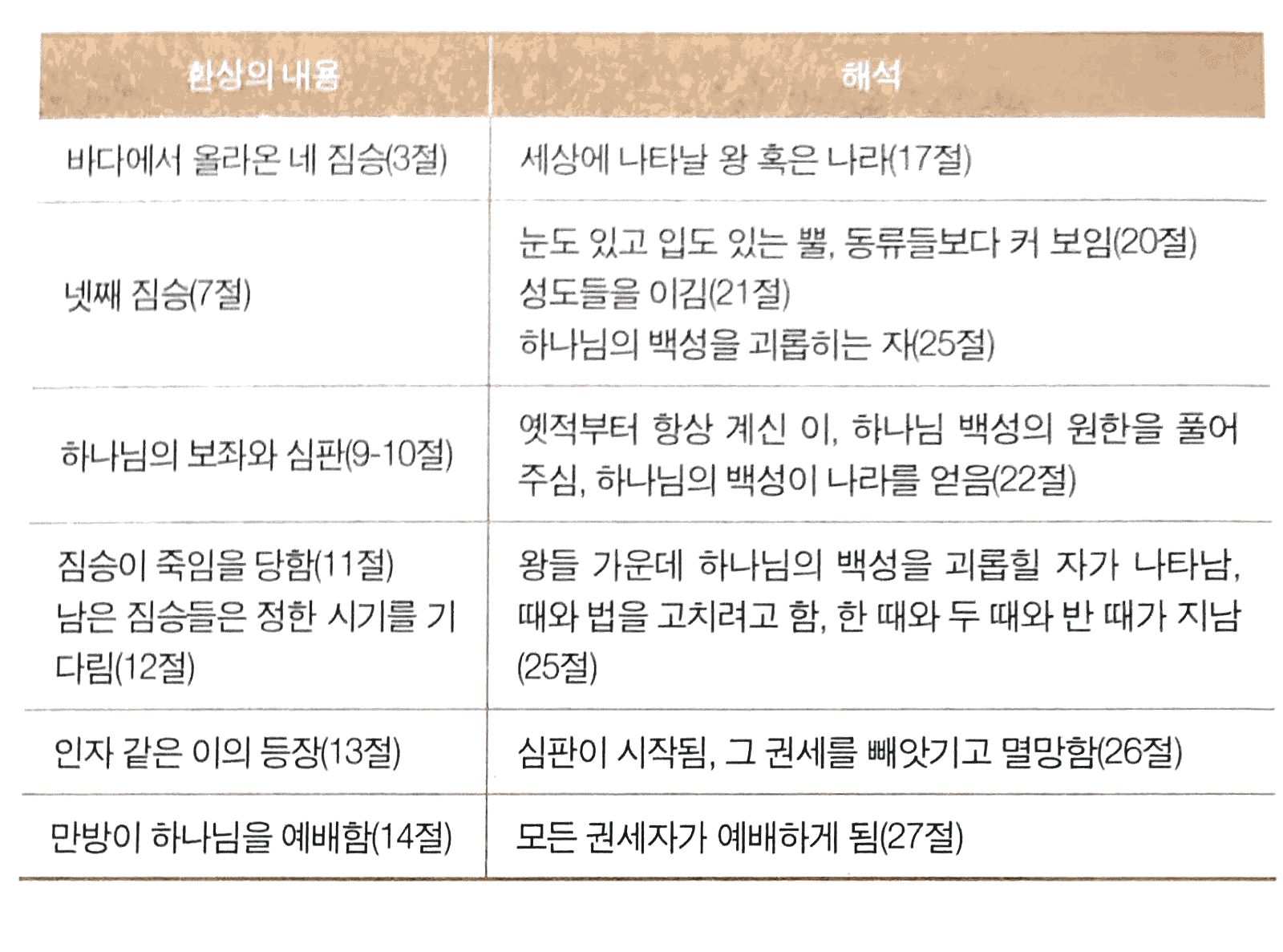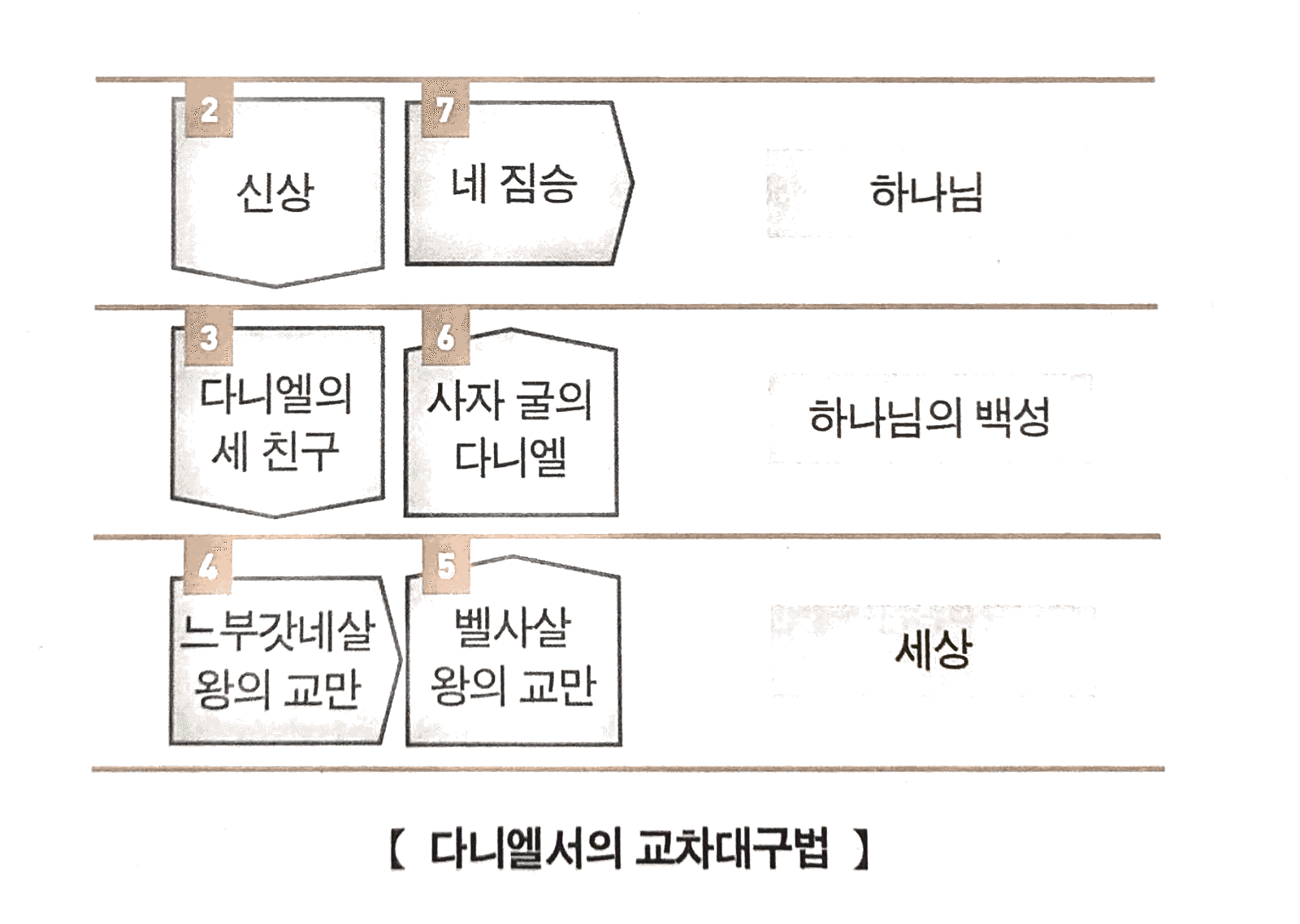 다니엘서 2장과 7장의 주제는 앞으로 전개될 ‘하나님 나라’에 대한 예언이다. 다니엘 3장과 6장의 주제는 ‘하나님의 백성’이 직면하게될 고난이다. 그리고 다니엘 4장과 5장의 주제는 ‘세상’의 왕들을 통해 세상 안에서 작동되고 있는 원리를 보여준다.