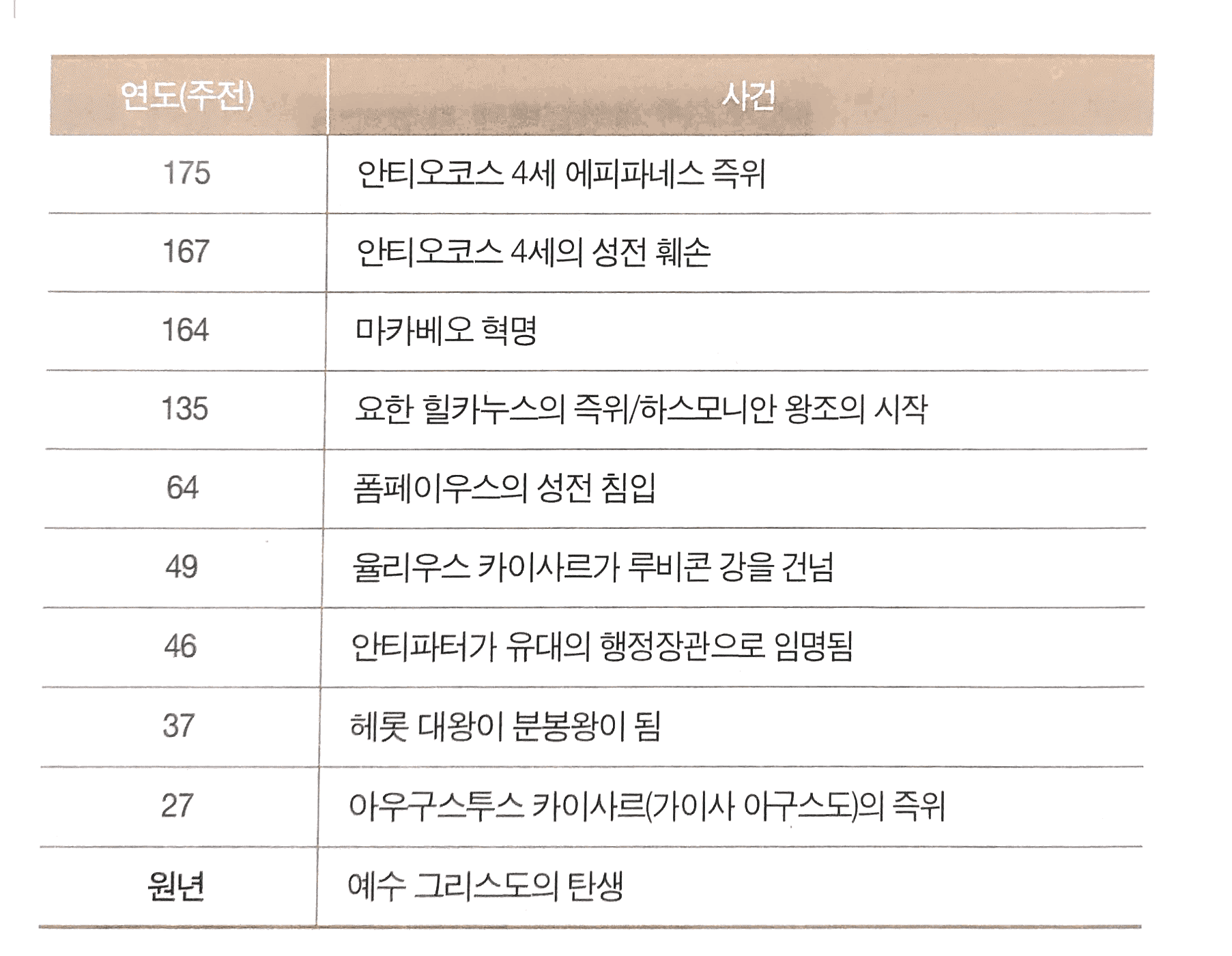 알렉산드로스 대왕 사후 이스라엘 북쪽은 셀레우코스 왕국이, 남쪽은 프톨레마이오스 왕국이 들어선다. 셀레루코스의 안티오코스 3세가 프톨레마이오스 옹국과 벌인 전쟁에서 승리하면서 이스라엘의 지배권은 프톨레마이오스 왕국에서 셀레우코스 왕국으로 넘어간다.