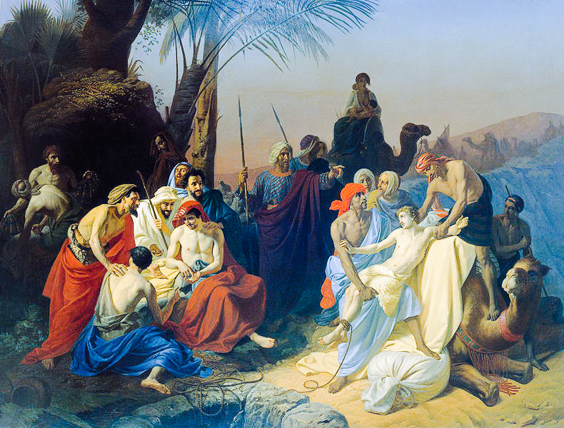 25-28절) 요셉을 구덩이에 던져 넣은채 형제들은 음식을 먹고 있었다. 그러던 중 한 무리의 이스마엘 사람들이 길르앗에서 오는 것을 보았는데 그들은 상인으로 낙타에 향품과 유향과 몰약을 싣고 애굽으로 가는 중이었다. 이번에는 유대가 형제들에게 요셉을 죽이는 것보다 그를 이스마엘 사람들에게 팔고 손대지 말자라고 말한다. 그리고 요셉을 구덩이에서 끌어올리고 미디안 상인들에게 은 20에 팔아 넘긴다. 이에 상인들은 요셉을 데리고 애굽으로 갔다.