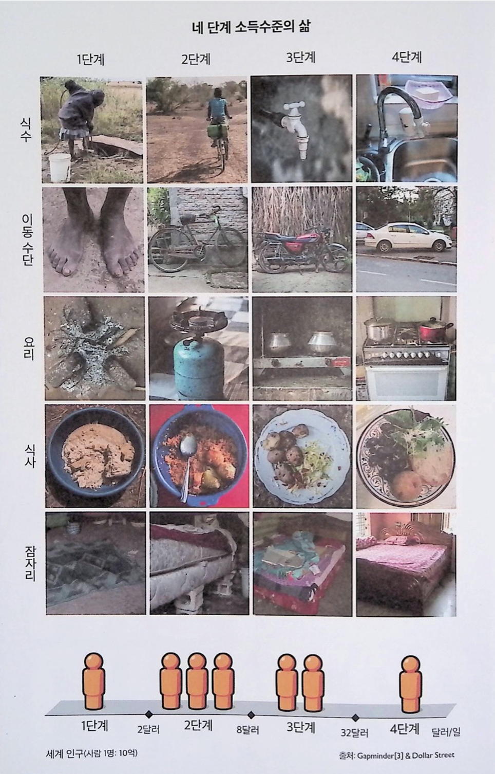 3) 위에서 내려다보는 시각은 모든 것을 다 똑같게 보게하지만 사실은 그렇지 않다. 하루 1달러를 버는 사람과 4달러, 16달러는 버는 사람은 그차이가 심하다. 하루 100달러 버는 사람이 보기에는 모두 가난해 보이지만.