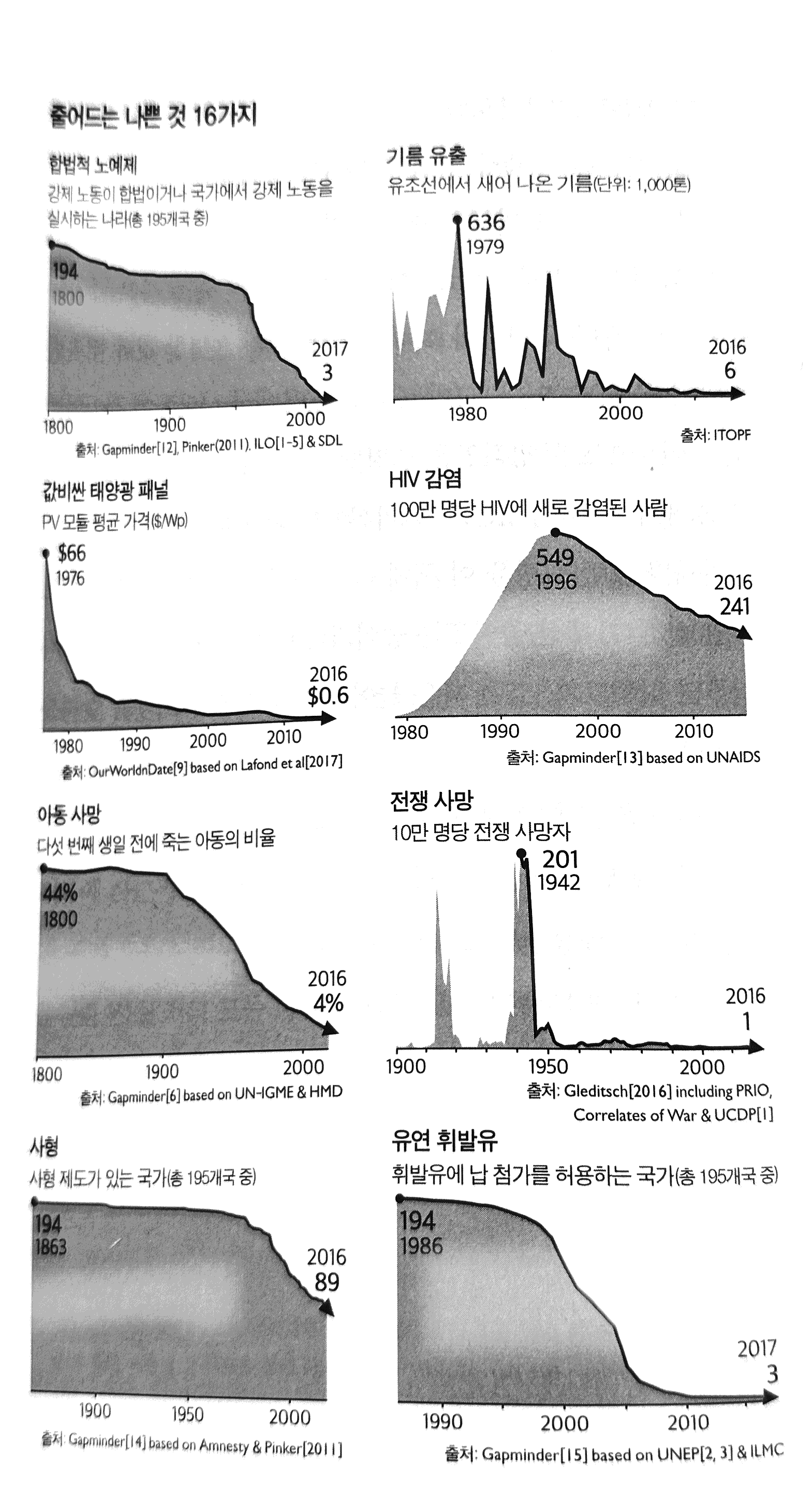 좋은것 보다 나쁜 것에 더 주목하는 이유는 첫째로 과거를 잘못 기억하기 때문이고, 둘째로 언론인과 활동가들이 사건을 선별적으로 보도하기 때문이며 셋째로 상황이 나쁜데 세상이 더 좋아진다고 말하면 냉정해 보이기 때문이다.