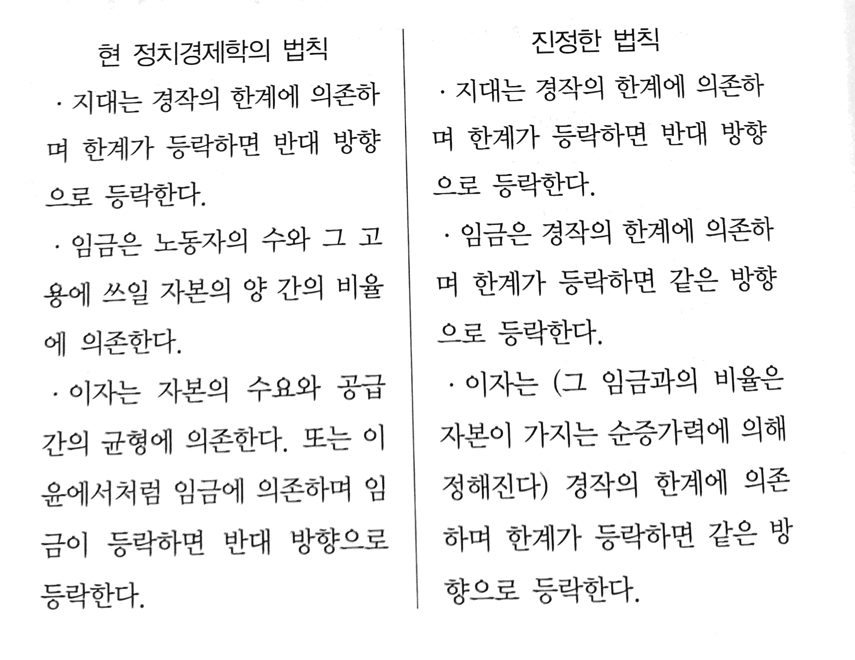 생산성 체감의 법칙 : 어떤 점 이상에서 노동과 자본의 추가 투입에 대한 토지의 생산이 줄어든다는 것이다. 하지만 저자는 이것이 외견상으로만 그럴 뿐이라고 주장한다.