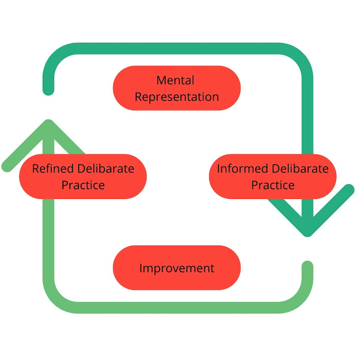 의식적인 연습의 핵심 목적은 효과적인 심적 표상을 개발하는 것이며, 심적 표상은 다시 의식적인 연습에서 핵심 역할을 한다.