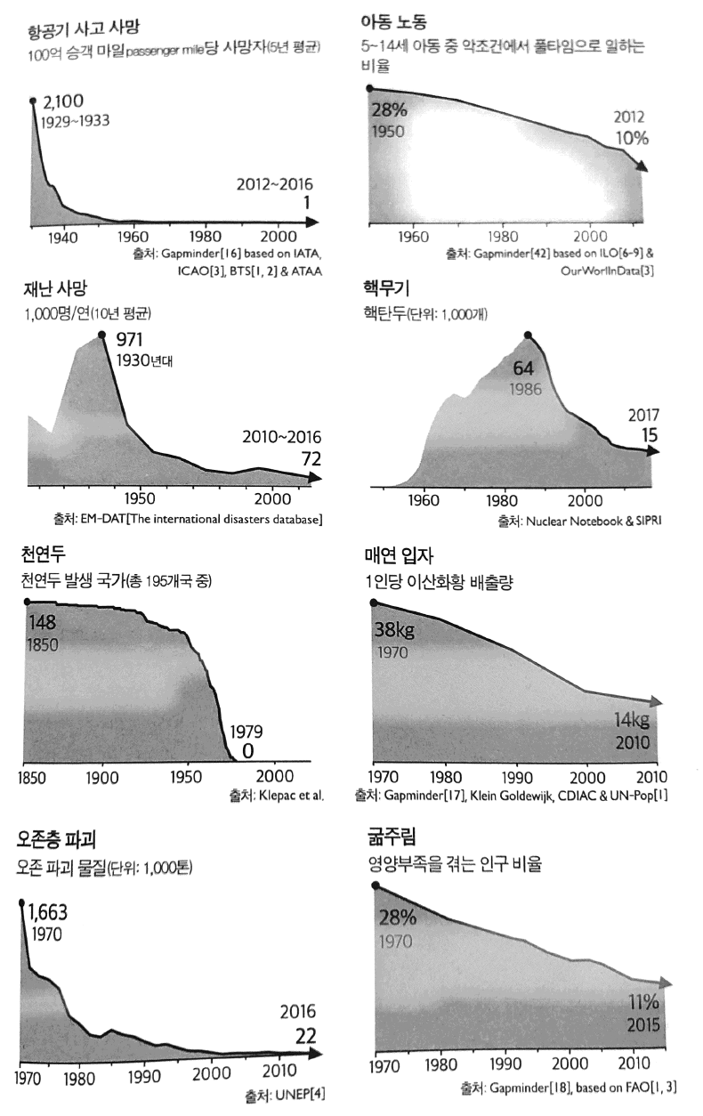 좋은것 보다 나쁜 것에 더 주목하는 이유는 첫째로 과거를 잘못 기억하기 때문이고, 둘째로 언론인과 활동가들이 사건을 선별적으로 보도하기 때문이며 셋째로 상황이 나쁜데 세상이 더 좋아진다고 말하면 냉정해 보이기 때문이다.